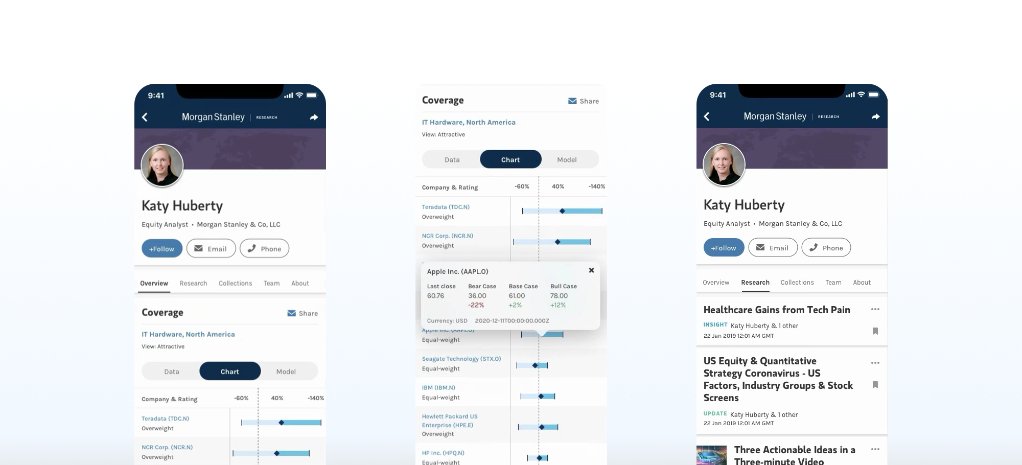 Designed Katy Hubert's coverage page — bear, base and bull case predictions, intricate financial charts and dense analyst commentary, resolved at the information density a research client expects without breaking the bank's restrained visual language.